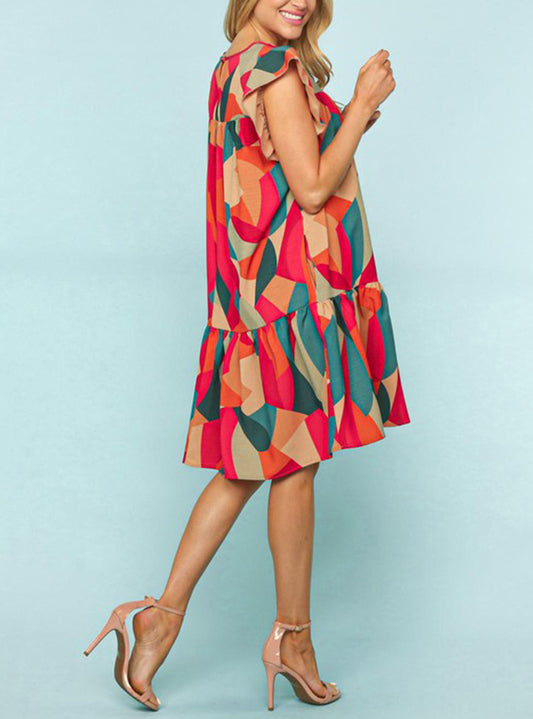 Abstract Geometric Print Flutter Sleeve Babydoll Dress