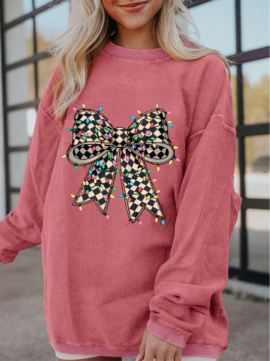 Checkered Bow Print Ribbed Crew Neck Pullover Sweatshirt