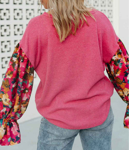 Floral Patchwork Flounce Sleeve Rib Knit Plus Top