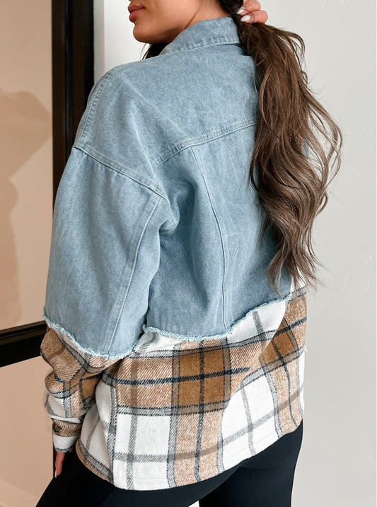 Plaid Patchwork Buttoned Oversized Denim Jacket