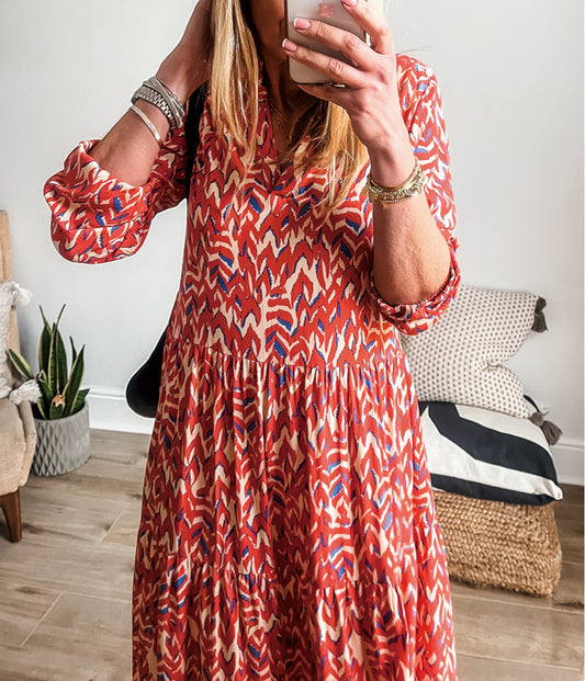 Abstract Print V Neck Pleated High Waist Midi Dress