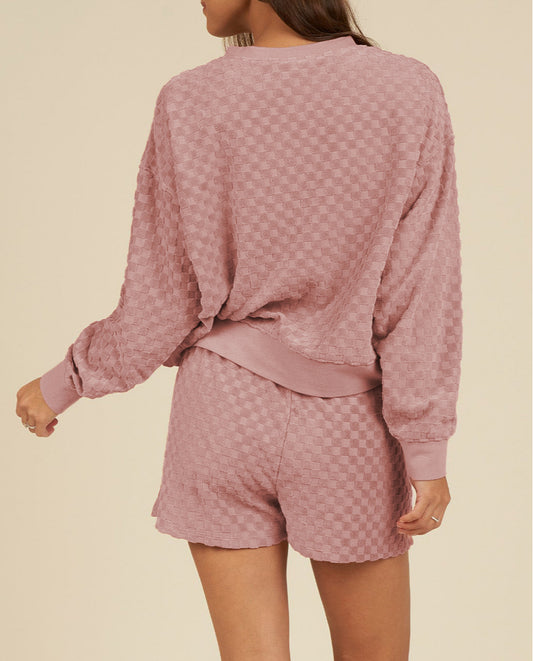 Checkered Textured Long Sleeve Top and Shorts Set