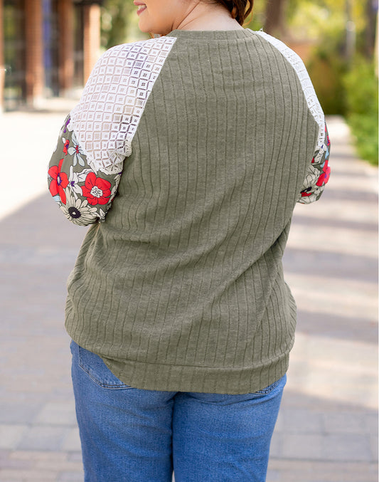 Plus Size Textured Floral Patchwork Raglan Sleeve Blouse