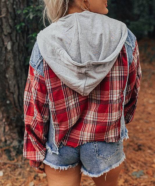 Plaid Print Patchwork Hooded Raw Hem Denim Jacket