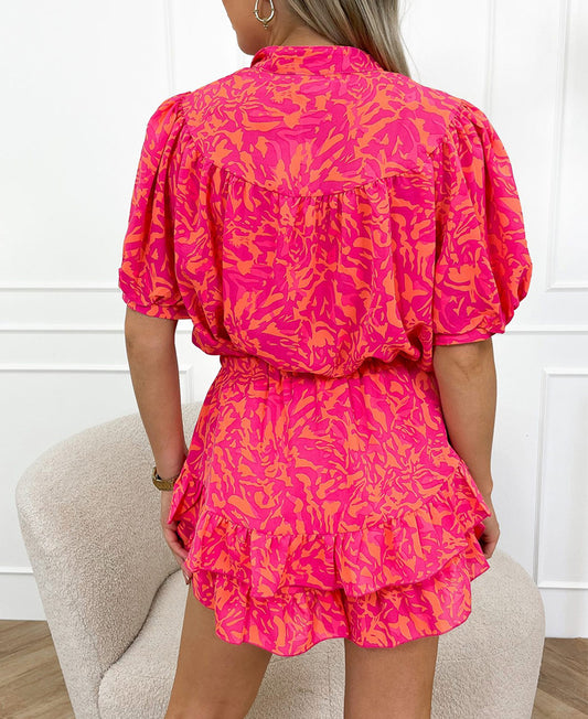 Abstract Print Puff Short Sleeve Ruffled Mini Dress