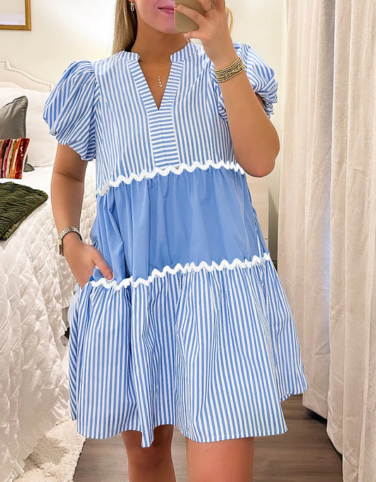 Ric Rac Striped Bubble Sleeve V Neck Dress