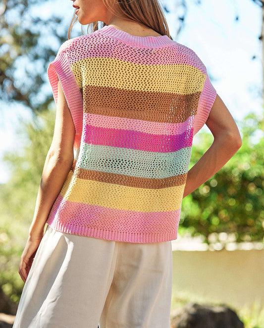 Stripe Crochet Cap Sleeve Loose Fit Sweater T Shirt