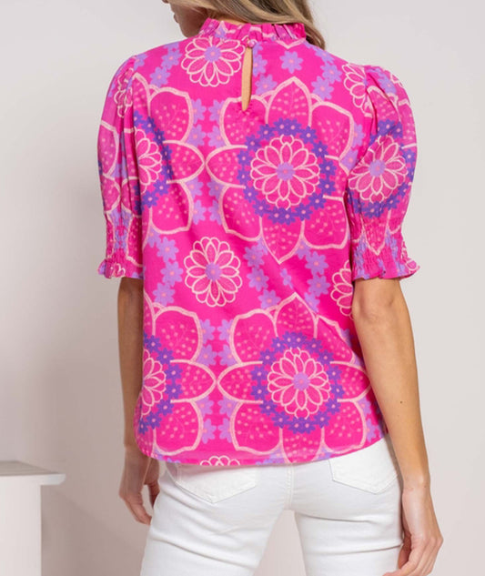 Floral Print Frilled Neck Smocked Puff Sleeve Blouse