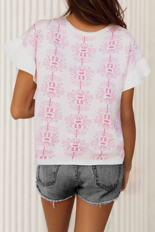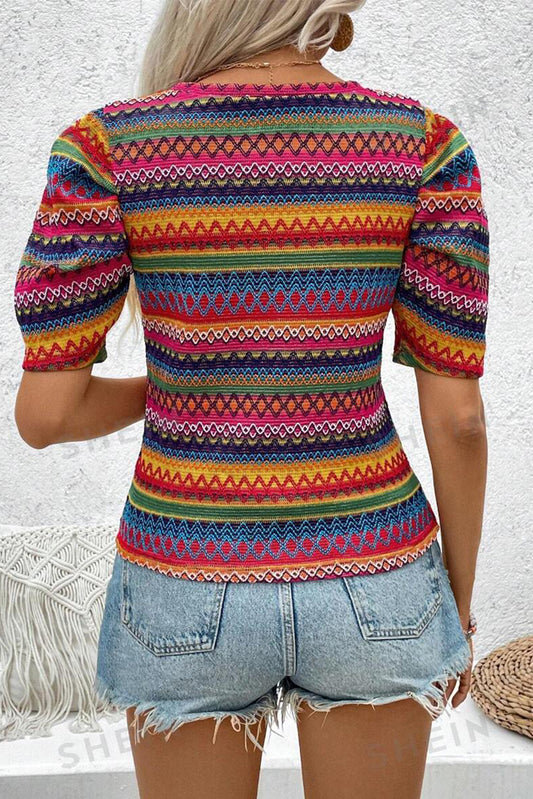 Jacquard Geo Patterned Puff Sleeve T Shirt