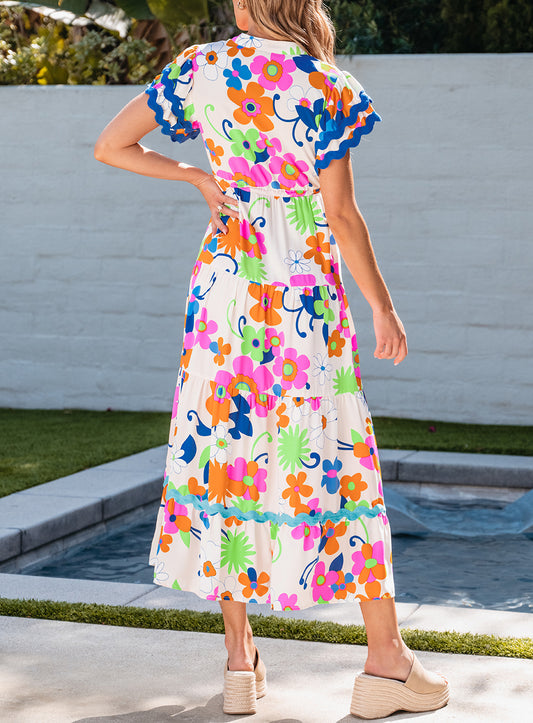 Ricrac Trim Flutter Sleeve Buttoned Floral Maxi Dress