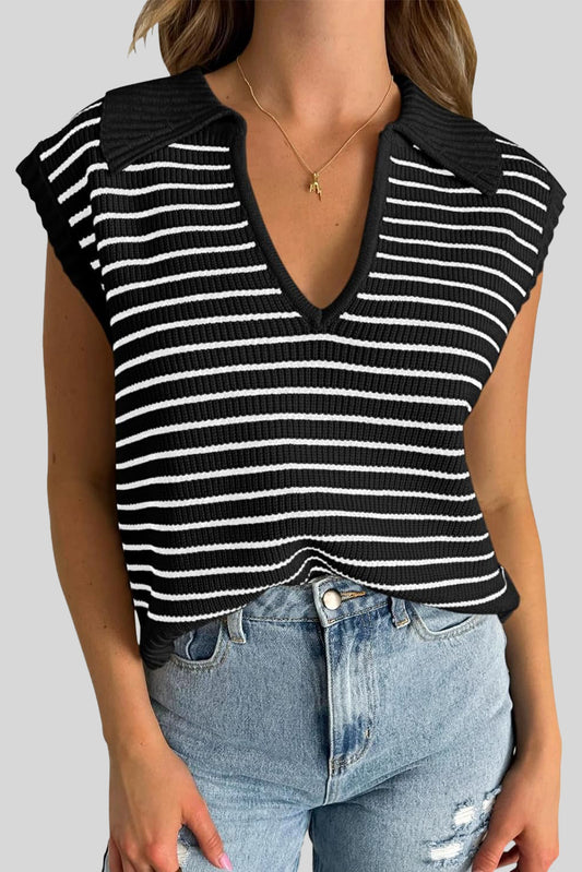 Stripe Turn-down V Neck Sweater Tank Top