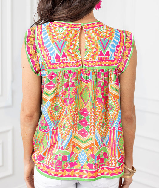 Geometric Print Ruffled Trim Tank Top