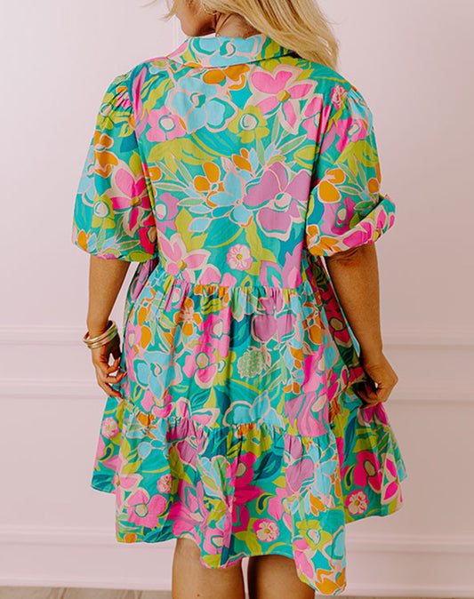 Plus Floral Print Puff Sleeve Tiered Shirt Dress