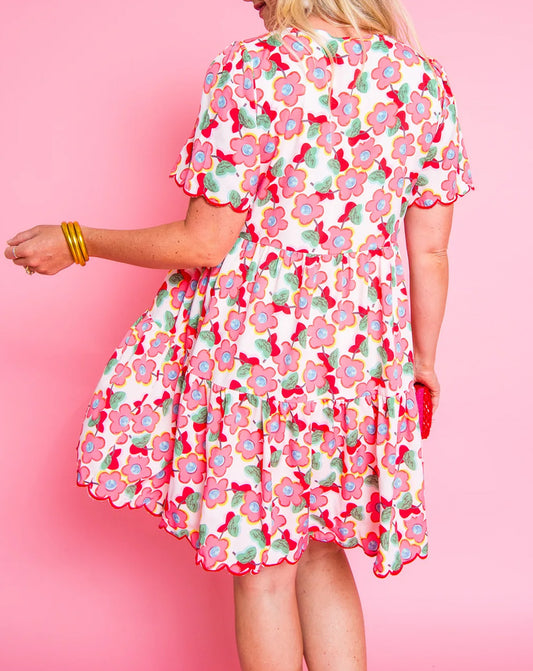 Flower Print Scalloped Short Sleeve Ruffled Dress