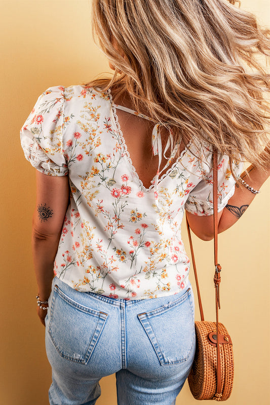 Floral Printed Split V Neck Puff Sleeve Blouse
