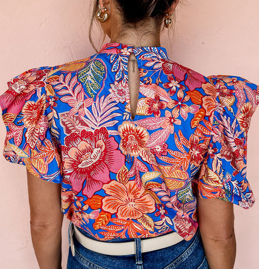 Floral Ruffled Puff Sleeve Mock Neck Blouse