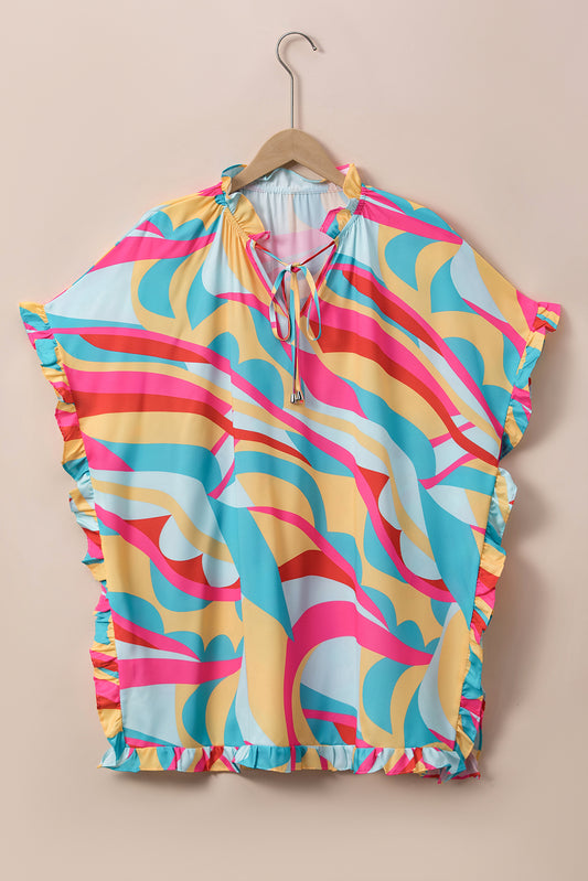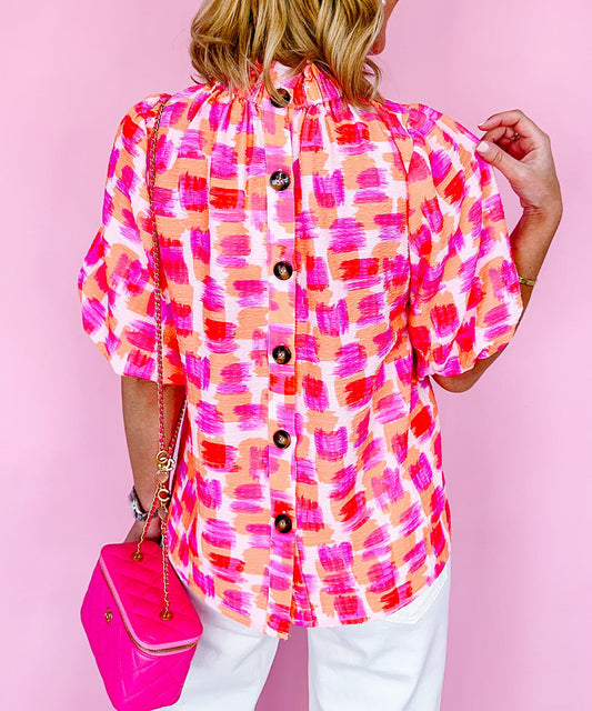 Abstract Print Button Back Ruffed High Neck Blouse