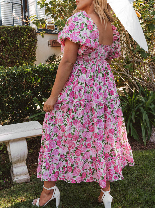 Plus Size Floral Print Smocked Puff Sleeve Dress
