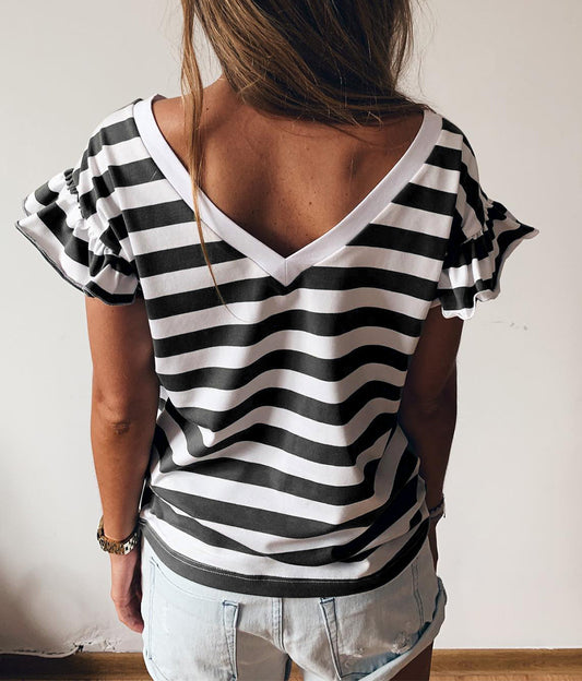 Colorblock Ruffled Sleeve Frill V Neck Blouse