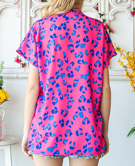 Contrast Leopard Print Plus Size V Neck Blouse