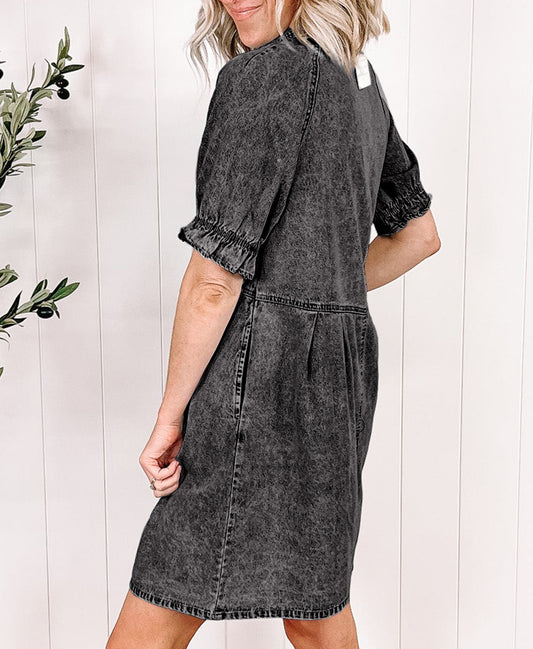 Mineral Wash Ruffled Short Sleeve Buttoned Denim Dress