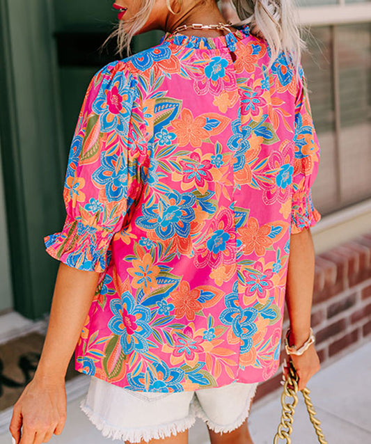 Frilly Mock Neck Short Puff Sleeve Floral Blouse