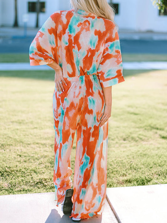 Bohemian Tie Dye Pleated Shirt Collar Loose Jumpsuit
