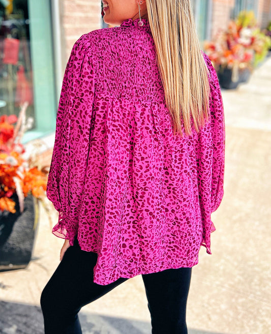 Leopard Shirred Puff Sleeve Flowy Blouse