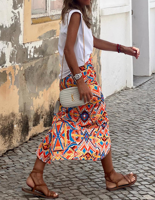 Geometric Abstract Print Slit High Waist Maxi Skirt