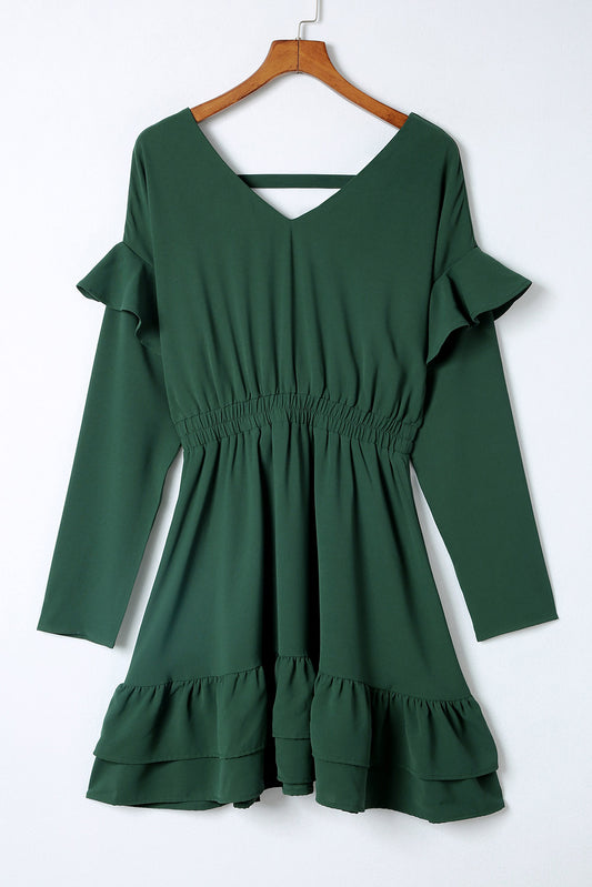 Solid Color Ruffled V Neck High Waist Mini Dress