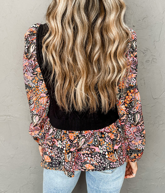 Printed Floral Bubble Sleeve Frill Mock Neck Blouse