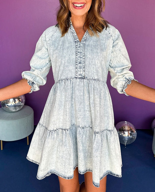 Acid Wash Retro Half Sleeve Flared Denim Dress