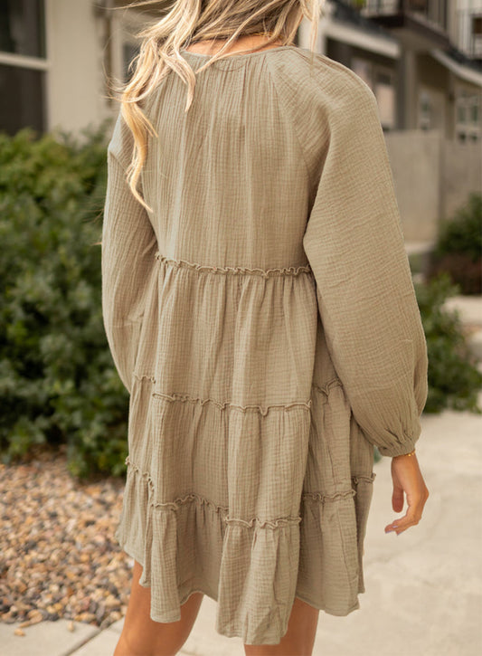Cotton Crepe V Neck Frill Tiered Mini Dress