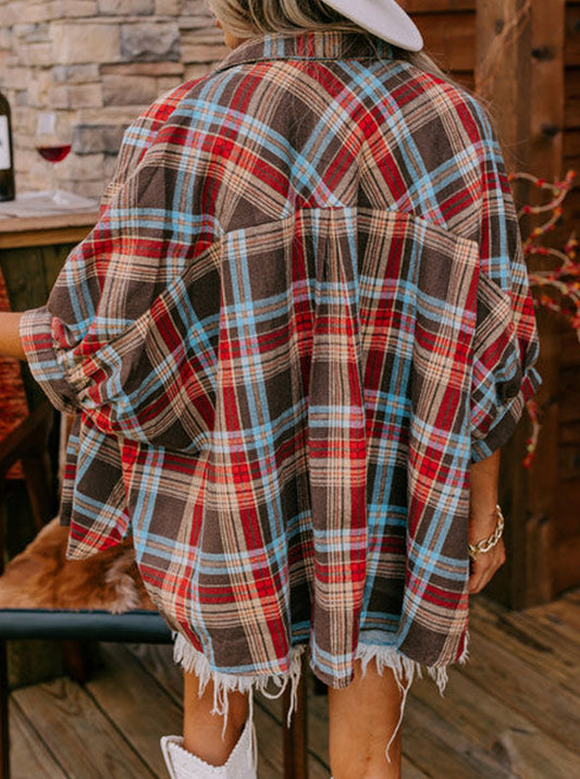 Red Loose Bracelet Sleeve Plaid Shirt