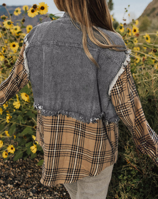 Plaid Patch Distressed Flap Pocket Denim Shacket