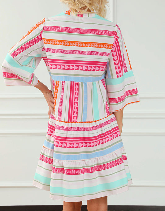 Boho Geometric Print Bracelet Sleeve Buttoned Mini Dress
