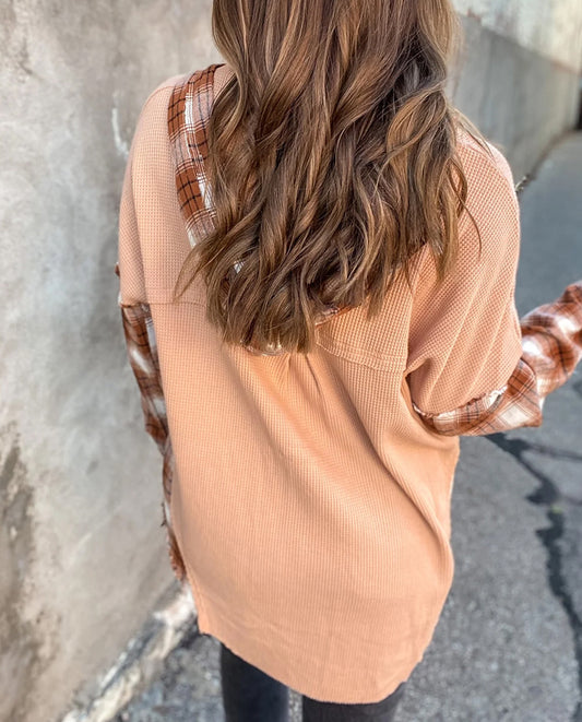 Waffle Knit Plaid Patchwork Hooded Shacket