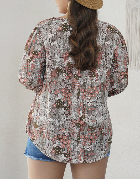 Plus Size Printed Long Sleeve Drawstring V Neck Blouse