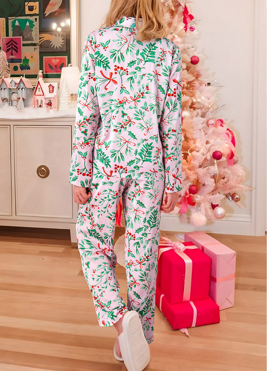 Christmas Berries Plant Print Satin Long Sleeve Pajama Set