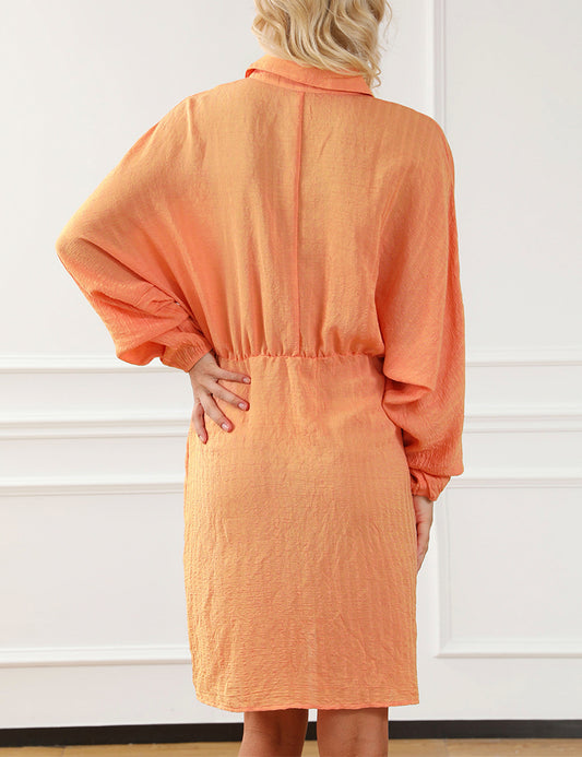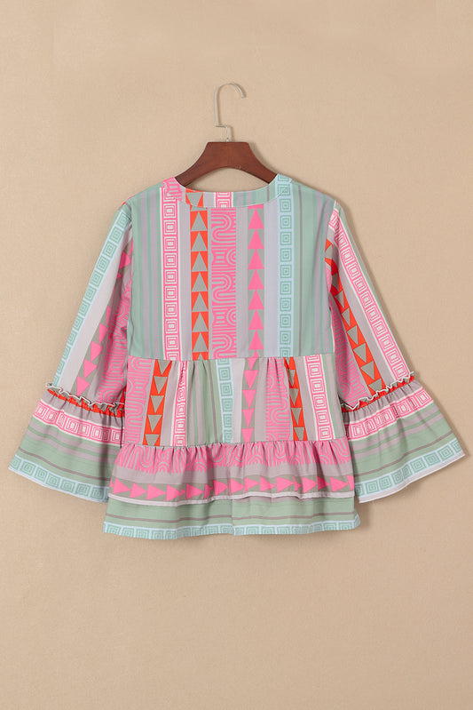 Geometric Print Stand Neck Balloon Sleeve Ruffled Dress