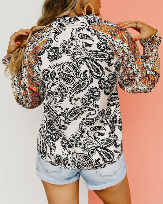 Floral Tasseled V Neck Puff Sleeve Blouse
