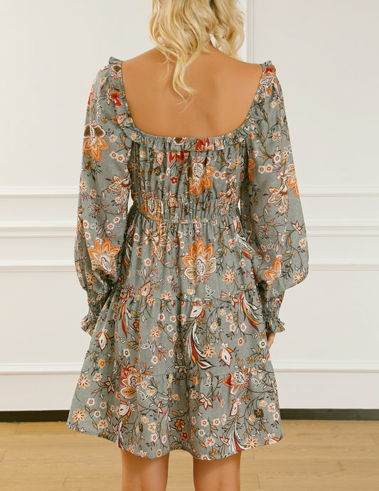 Floral Long Sleeve Frilled U-Neck Ruffled Dress