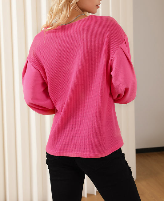 Waffle Knit Balloon Sleeve Splicing V Neck Top