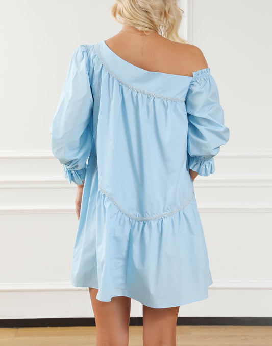Exquisite Trim Puff Sleeve Asymmetric Swing Mini Dress