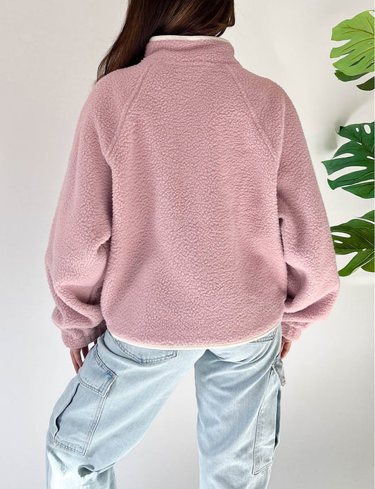 Fushia Stand Neck Half Button Zip Pocket Plush Sweatshirt