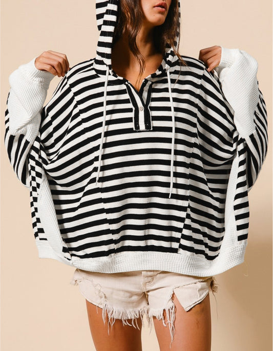 Oversized Striped Henley Buttons Dolman Sleeve Hooded Top