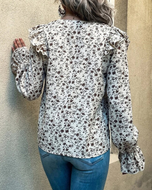 Floral Print V Neck Ruffled Blouse