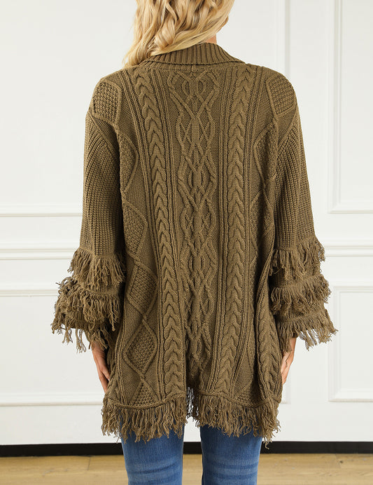 Fringe Trim Cable Knit Open Cardigan