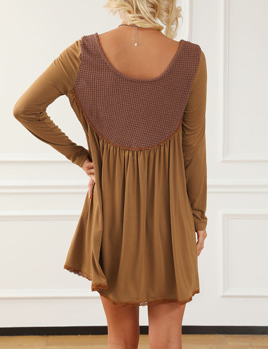 Textured Accent Patchwork Long Sleeve Flare Dress