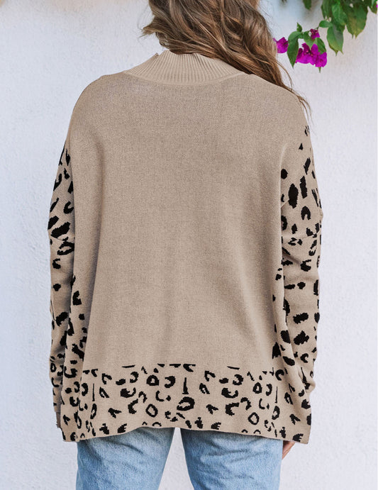 Sequin Turkey Leopard Mixed Pattern High Neck Sweater with Slits
